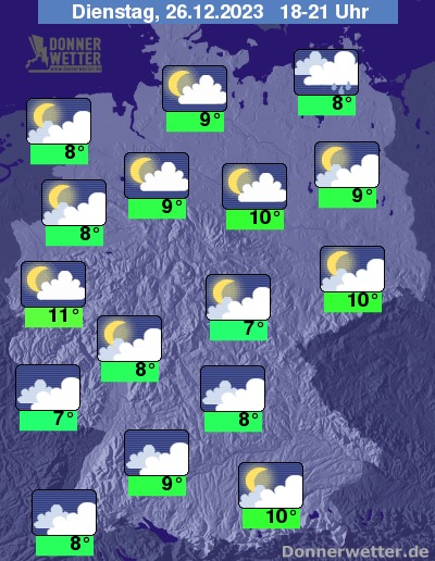 In der Nacht zum Mittwoch zeigt sich der Himmel oft stark und gebietsweise auch etwas aufgelockert bewölkt, dazu bleibt es weitgehend trocken. Stellenweise bildet sich Nebel. Die Temperatur sinkt auf 8 Grad in Stuttgart und bis 3 Grad in Jena. Der anfangs an der Ostsee noch starke Wind lässt im Nachtverlauf deutlich nach.