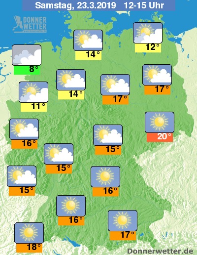 Heute Nachmittag ist es über der Nordwesthälfte des Landes aufgelockert oder stark bewölkt. Im Osten zeigt sich noch oft die Sonne, teils ist es hier aber ebenfalls schon stark bewölkt. Im Süden ist es hingegen verbreitet sonnig. Es bleibt landesweit trocken bei 8 Grad an der Nordsee und bis 20 Grad in der Lausitz.
