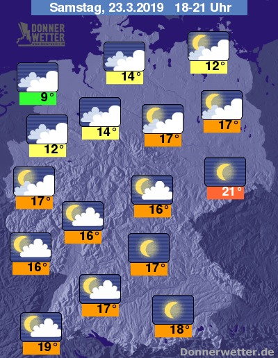 Heute Abend ist es im Süden und Osten noch oft locker bewölkt oder sternenklar, dagegen halten sich über dem Norden und Westen überwiegend dichte Wolken, die jedoch keinen Regen bringen. Die Temperatur liegt anfangs bei 9 Grad in Emden und bis 21 Grad in Dresden.