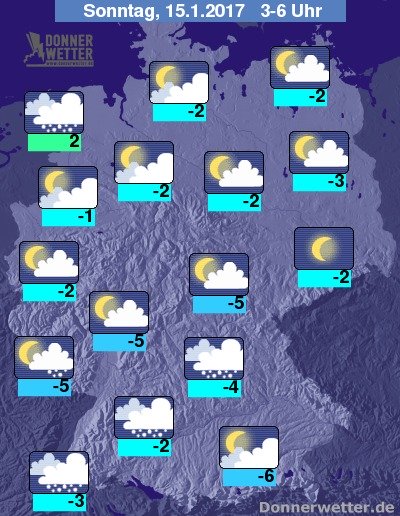 In der Nacht zum Sonntag ziehen über den Süden und im weiteren Verlauf auch über den Nordwesten und Norden dichte Wolken mit Schneefällen hinweg. Es besteht Glättegefahr! In den anderen Landesteilen bleibt es hingegen überwiegend locker bewölkt oder sternenklar und auch trocken. Die Tiefstwerte liegen bei 2 Grad an der Nordsee und bis -6 Grad in München.