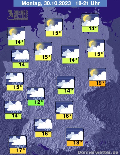 Heute Abend breitet sich der Regen im Verlauf bis etwa über die Westhälfte Deutschlands aus, dazu bleibt es bedeckt. Weiter nach Osten hin ist es meist trüb oder stark bewölkt, anfangs noch teils aufgelockert bewölkt, dazu bleibt es noch weitgehend trocken. Die Temperatur liegt bei 12 Grad in Wiesbaden und 19 Grad in Dresden.