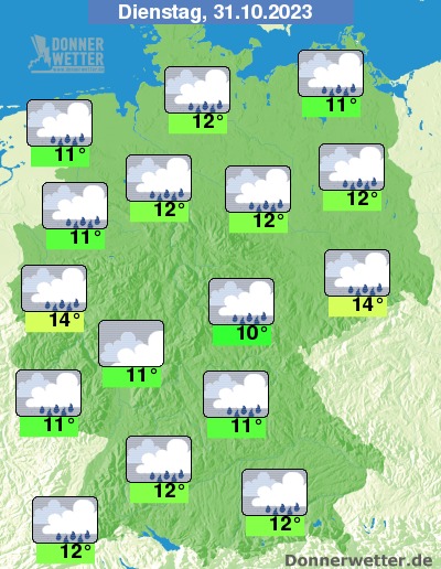 Am Dienstag bleibt es den Tag lang überwiegend stark bis dicht bewölkt, nur selten können sich auch Auflockerungen zeigen. Es bilden sich immer wieder Schauer oder es fällt zeitweise Regen. Die Temperatur erreicht 10 Grad im Vogtland und bis 14 Grad im Rheinland.