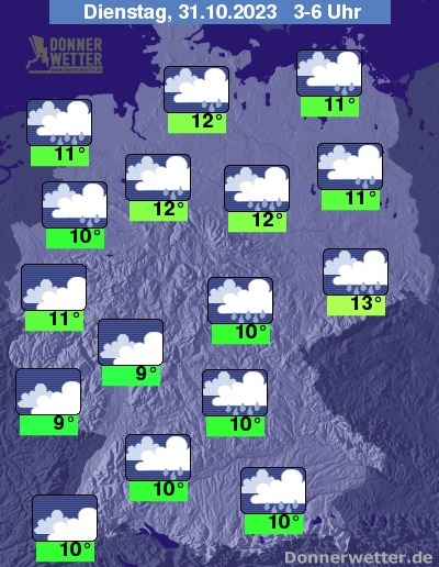 In der Nacht zum Dienstag überzieht der zeitweilige Regen auch auf die Osthälfte des Landes, während die Niederschläge weiter nach Westen hin von Westen nach und nach abklingen. Es bleibt aber bei weitgehend dichter Bewölkung. Die Temperatur sinkt auf 13 Grad in der Lausitz und 9 Grad am Pfälzer Wald.