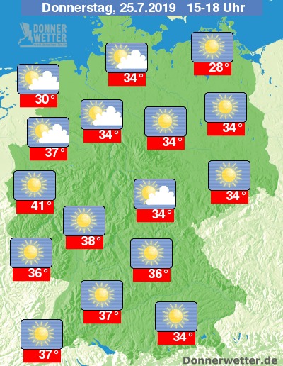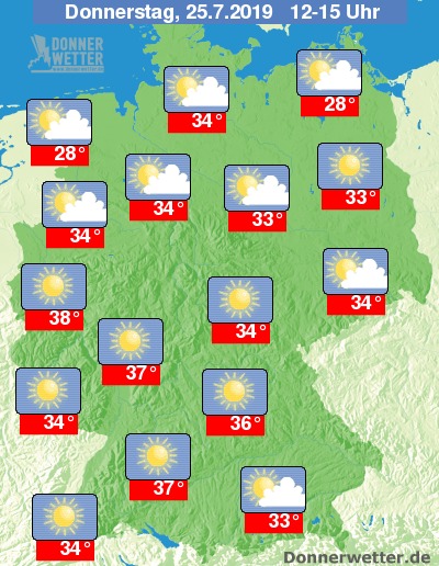 Die Temperaturen bewegen sich meist zwischen schweißtreibenden 33 und 38 Grad. Etwas erträglicher bleibt es an den Küsten von Nord- und Ostsee, auf den Inseln, sowie auf den Bergen.