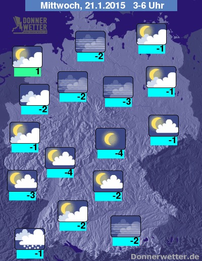 In der bevorstehenden Nacht klingen die Schneefälle im Nordosten und Osten Deutschlands ab und die Bewölkung kann auch hier zeitweise auflockern. Sonst ist es bereits meist locker oder aufgelockert bewölkt, vor allem in der Westhälfte zu Beginn noch häufig sternenklar, und es bleibt trocken. Nur im äußeresten Südwesten können sich im Laufe der Nacht bei teils dichten Wolken einzelne Schneefälle entwickeln. Stellenweise bildet sich Nebel oder Hochnebel. Die Temperatur sinkt auf 1 Grad an der Nordseeküste und bis -4 Grad im Coburger Land.