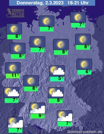 Heute Abend können sich im Alpenvorland viele und zum Teil dichte Wolken halten. Vor allem nördlich des Mains zeigt sich der Himmel aber sternenklar. Es bleibt landesweit trocken bei Abendwerten von 5 Grad in Erfurt und bis zu 11 Grad in Köln.