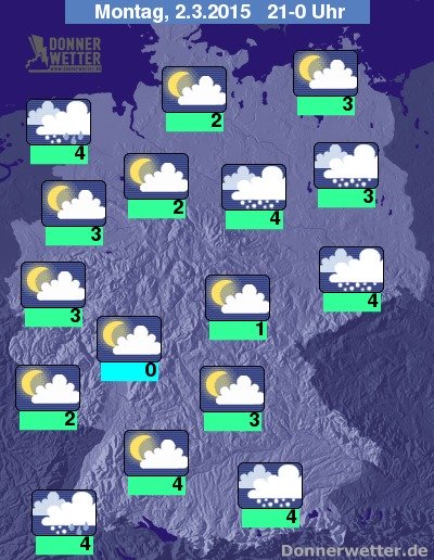Heute Abend fällt vor allem im Osten, aber auch im Süden von Deutschland noch häufig Schnee, Schneeregen oder Regen, dazu besteht vielerorts auch Glättegefahr. Auch an der Nordsee ziehen immer wieder teils kräftige Schauer mit teils auch Schneeregen oder Schnee durch. In den anderen Landesteilen bleibt es hingegen überwiegend aufgelockert und oft auch nur gering bewölkt und dazu weitgehend trocken. Die Abendtemperatur liegt bei 4 Grad in Magdeburg und um 0 Grad im Westerwald. Es weht weiterhin oft frischer bis starker und in Böen teils stürmischer Wind. Auf den Bergen und an den Küsten sind Sturmböen, an der Nordsee auch orkanartige Böen möglich.