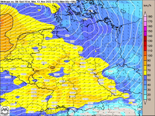 Die Karte zeigt die zu erwartenden Spitzenwindböen für Montag (18:00 Uhr):