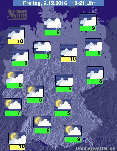 Heute Abend halten sich über der Nordhälfte Deutschlands verbreitet dichte Wolken, die hier und da leichten Regen bringen können. Weiter nach Süden hin ist es hingegen überwiegend nur locker, teils aufgelockert bewölkt und es bleibt dazu trocken. Die Abendwerte liegen zwischen 5 und 10 Grad.