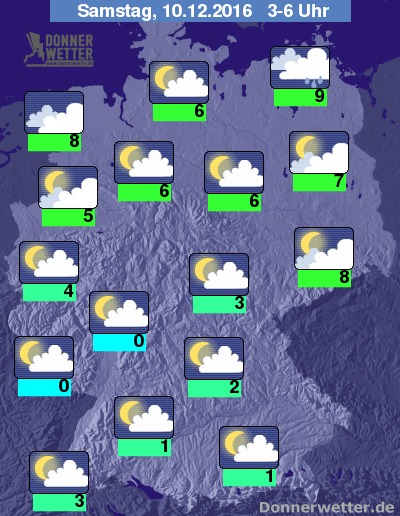 In der Nacht zum Samstag halten sich im Nordosten und im Nordseeumfeld dichte Wolken aus denen gelegentlich Regen fallen kann, sonst zeigt sich die Nordosthälfte Deutschlands auch teils stark, teils jedoch auch aufgelockert bewölkt und trocken. Im Süden und Westen ist der Himmel meist locker bewölkt, hier bleibt es ebenfalls trocken. Die Temperatur sinkt auf 9 Grad in Rostock und bis 0 Grad am Taunus.