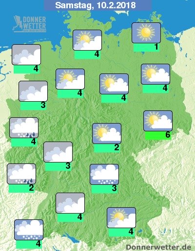 Am Samstag kann sich im Norden und Osten häufig die Sonne zeigen. Dagegen ziehen über der Südwesthälfte zunehmend dichte Wolken auf, die hier gebietsweise auch Schnee oder Schneeregen bringen, sonst bleibt es trocken. Die Temperatur steigt auf 1 bis 6 Grad.