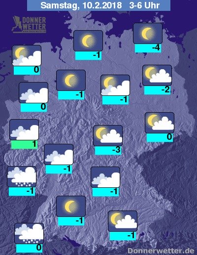 In der Nacht zum Samstag fällt westlich des Rheins unter dichten Wolken gebietsweise Schnee. Im Norden ist es meist sternenklar, im übrigen Bundesgebiet ist verbreitet leicht bis wechselnd und selten auch stark bewölkt, dazu bleibt es trocken. Die Temperatur sinkt auf 1 Grad im Rheinland und bis -4 Grad an der Müritz.