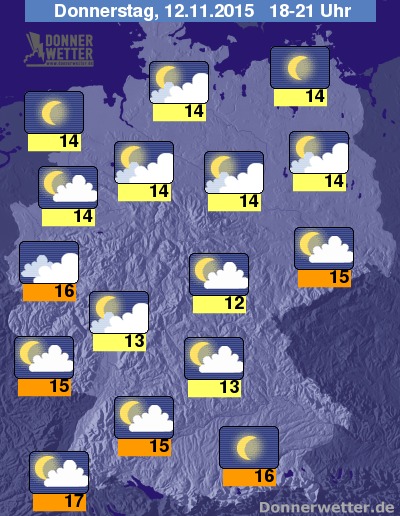 Im weiteren Abendverlauf ändert sich nicht viel am Himmelsbild. Die Temperaturen sinken auf Werte von 12 bis 8 Grad C.