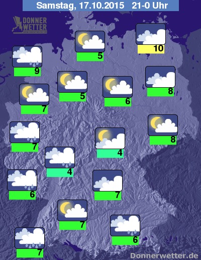 Heute Abend ziehen über den Süden, Westen und das Nordseeumfeld dichte Wolken mit zeitweiligem Regen. Im Nordosten und Osten des Landes ist es weitgehend stark bewölkt, aber trocken. Im übrigen Bundesgebiet lockert es verbreitet auf, es können jedoch auch dichte Wolken durchziehen, dabei bleibt es jedoch trocken. Die Abendtemperatur liegt bei 10 Grad an der Ostseeküste und um 4 Grad im Eichsfeld.