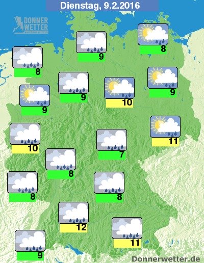 Am Dienstag ist es im Norden und Osten des Landes anfangs noch oft locker oder aufgelockert bewölkt und dazu auch trocken, weiter nach Südwesten hin ziehen dagegen bereits dichte Wolken durch und es fällt zum Teil kräftiger und auch langanhaltender Regen. Im Tagesverlauf zieht der Regen auch in den Norden und Osten Deutschlands. Die Temperatur steigt auf 7 Grad in Oberfranken und bis 12 Grad in Stuttgart. Es weht teils starker bis stürmsicher Wind.