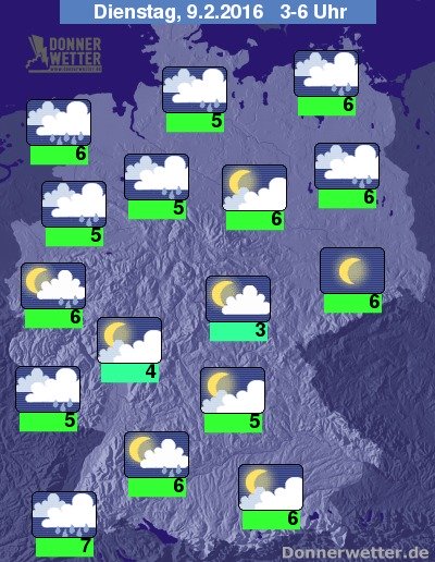 Heute Abend lockert die Bewölkung vor allem im Osten und Nordosten häufig auf, hier bleibt es meist trocken. Im großen Rest der Republik halten sich dagegen weitgehend dichte Wolken und dazu fällt auch immer wieder, teils kräftiger und auch langanhaltender Regen. Die Abendwerte liegen bei 9 Grad in Dresden und etwa 4 Grad am Westerwald. Es weht teils starker, im Norden starker bis stürmischer Wind mit schweren Sturmböen. An der Küste und auf den Bergen der norddeutschen Mittelgebirge herrscht Sturm, dabei sind orkanartige Böen möglich.