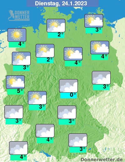 Heute ist es über der Südhälfte des Landes dicht bewölkt oder trüb. Oft hält sich auch zäher Nebel. Im übrigen Bundesgebiet ist es teilweise heiter, teils hält sich auch dichte Bewölkung, dabei bleibt es trocken. Die Temperatur erreicht 0 Grad im Vogtland und bis 5 Grad im Rheinland.