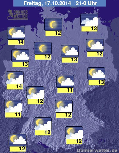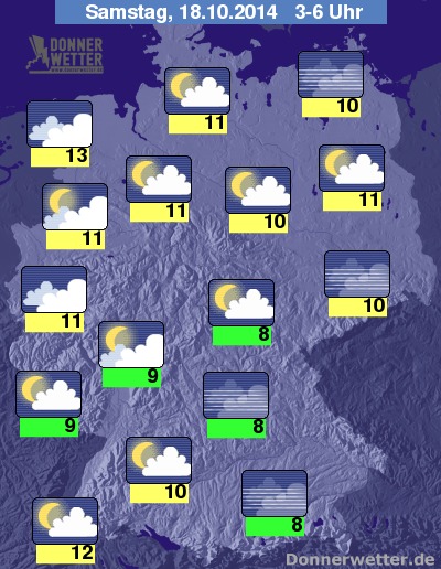 In der Nacht zum Samstag ziehen meist nur lockere Wolkenfelder übers Land, gebietsweise klart der Himmel auch komplett auf, dazu bleibt es trocken. Es bildet sich jedoch stellenweise Nebel oder Dunst. Die Temperatur sinkt auf 13 Grad an der Nordsee und rund 8 Grad in Oberbayern.