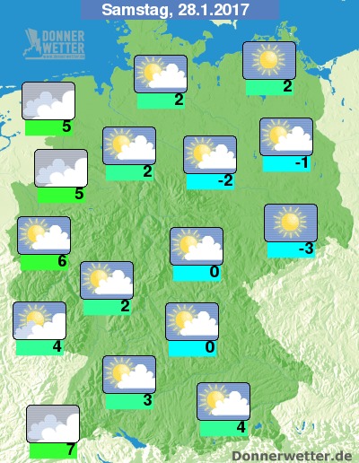 Am Samstag zeigt sich das Wetter meist recht freundlich bei einem Mix aus Sonne und überwiegend lockeren bis aufgelockerten Wolken. Sonnig ist es vor allem über Sachsen und im Ostseeumfeld. Teils dichte Wolken halten sich über dem Südwesten und dem Niederrhein, jedoch bleibt es auch hier trocken. Die Temperatur erreicht -3 Grad in Dresden und bis 7 Grad in Freiburg.