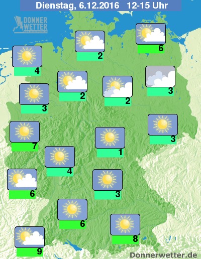 Heute Nachmittag ziehen über den Norden, Nordosten und Osten gebietsweise dichte Wolken hinweg, die aber nur hier und da etwas Regen oder gefrierenden Regen bringen können, dabei ist stellenweise Glätte möglich! Im übrigen Bundesgebiet ist es aber verbreitet sonnig oder auch regional mal locker bewölkt und trocken. Die Temperatur liegt bei 1 Grad im Thüringer Becken und bis 9 Grad in Freiburg.