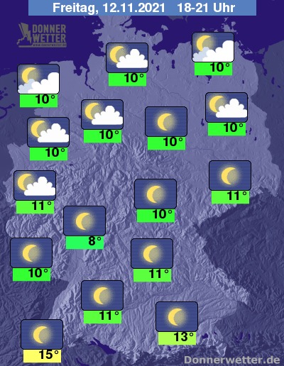 Heute Abend zeigt sich der Himmel über der Südosthälfte des Landes sternenklar, weiter nach Nordwesten hin ziehen teils einige Wolkenfelder durch, jedoch bleibt es landesweit trocken. Die Temperatur liegt bei 8 Grad am Westerwald und bis 15 Grad in Freiburg.