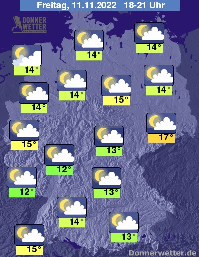 Heute Abend ist es oft nur locker bewölkt oder auch sternenklar, hier und da halten sich aber auch dichte Wolken oder es ist trüb, jedoch bleibt es trocken. Die Temperatur liegt bei 12 Grad in Saarbrücken und bis 17 Grad in Dresden.