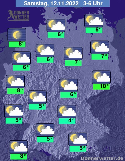 In der Nacht zum Samstag zeigt sich der Himmel über Deutschland verbreitet locker bewölkt und nicht selten auch sternenklar. Stellenweise können sich jedoch auch dichtere Wolken halten. Es bleibt trocken bei Tiefstwerten von 10 Grad in Dresden und 4 Grad in Nürnberg.
