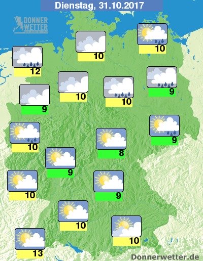 In der Nacht zum Dienstag ist es im Norden zum Teil locker bewölkt oder klar, oft ziehen hier aber auch dichte Wolken durch, dabei fällt aber nur selten etwas Regen. Weiter nach Süden hin zeigt sich der Himmel zunehmend sternenklar, dazu bleibt es trocken. Stellenweise bildet sich Nebel oder Hochnebel. Die Temperatur sinkt auf 9 Grad in Emden und bis 1 Grad in Mittelfranken.