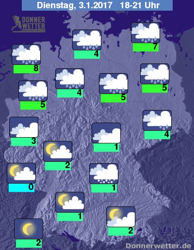 Heute Abend ist es vom Süden bis in den Südwesten weitgehend locker bewölkt oder im Südwesten auch sternenklar und dazu trocken. Im großen Rest der Republik halten sich jedoch dichte Wolken und besonders über der Nordhälfte fällt zum Teil langanhaltender Regen, über Thüringen und Nordbayern auch teils Schnee. Die Temperatur liegt bei 0 Grad am Pfälzer Wald und um 8 Grad in Emden. Über der Nordhälfte weht ein oft starker und teils stürmischer Wind. An Nord- und Ostsee herrscht in weiten Teilen Sturm.