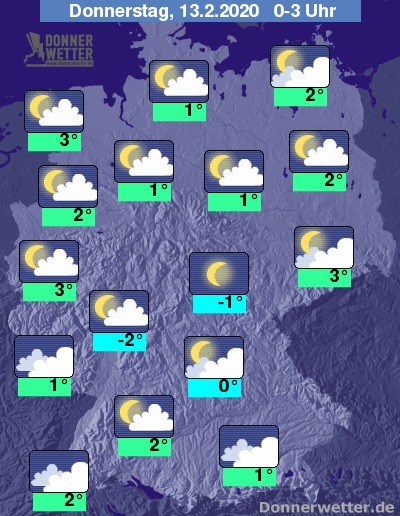 In der Nacht auf Donnerstag ist der Himmel über weiten Landesteilen locker oder aufgelockert bewölkt, in der Mitte und im Osten funkeln die Sterne zeitweise auch mal von einem wolkenlosen Himmel. Dichter sind die Wolken anfangs noch im Süden. An der Ostseeküste verdichten sich die Wolken dagegen im Laufe der zweiten Nachthälfte und es kann etwas Regen, Sprühregen oder Schneeregen fallen. Vorsicht, Glättegefahr!