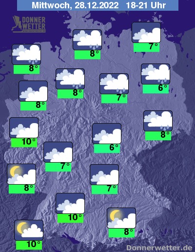 Heute Abend zeigen sich im Süden gebietsweise Auflockerungen, sonst ist es jedoch verbreitet bedeckt und besonders im Norden, jedoch auch im Westen und Osten fällt gebietsweise Regen. Im übrigen Land bleibt es trocken bei 6 Grad in Erfurt und 10 Grad in Köln. Im Norden und Westen ist es zum Teil stürmisch, an der Nordsee herrscht Sturm.