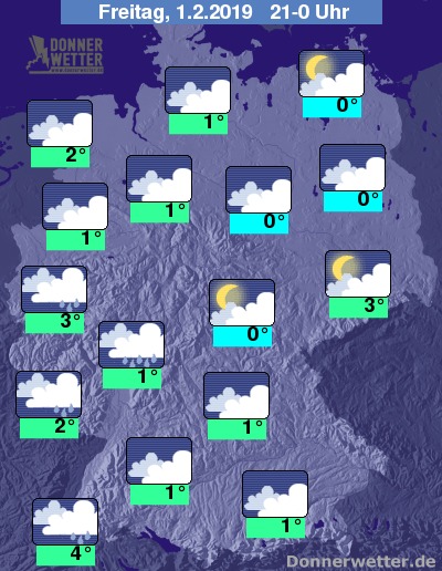 Am Abend bleibt der Himmel meist stark bewölkt oder bedeckt, im Südosten kann es stellenweise auch mal auflockern. Bis auf einzelne Schauer im Südwesten, die meist als Regen oder Schneeregen fallen, bleibt es überwiegend trocken.