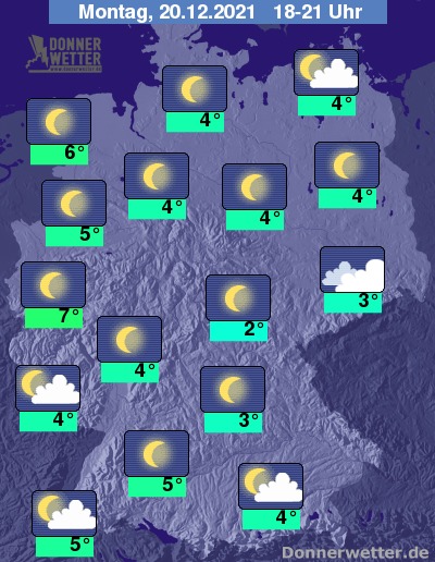 Heute Abend halten sich am Alpenrand, im östlichen Vorpommern und über Sachsen noch oft einige, teils dichte Wolken. Im übrigen Bundesgebiet zeigt sich der Himmel dagegen verbreitet sternenklar, dazu bleibt es trocken. Die Temperatur liegt bei 2 Grad in Erfurt und bis 7 Grad in Köln.