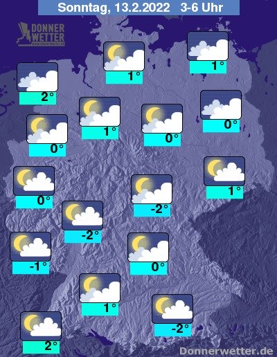In der folgenden Nacht ziehen oft viele und zum Teil auch dichte Wolken durch. Dazwischen zeigen sich aber auch Gebiete mit nur lockerer oder aufgelockerter Bewölkung. Es bleibt landesweit trocken bei Tiefstwerten von 2 Grad an der Nordsee und bis -2 Grad im Vogtland.