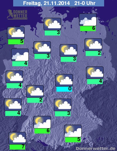 In der Nacht zum Samstag bleibt es bei der lockeren bis aufgelockerten Bewölkung, dabei bleibt es überall trocken. Besonders im Süden und Osten kann sich stellenweise Nebel oder Hochnebel bilden. Die Tiefstwerte liegen bei 7 Grad in Freiburg und etwa -1 Grad im Thüringer Becken.