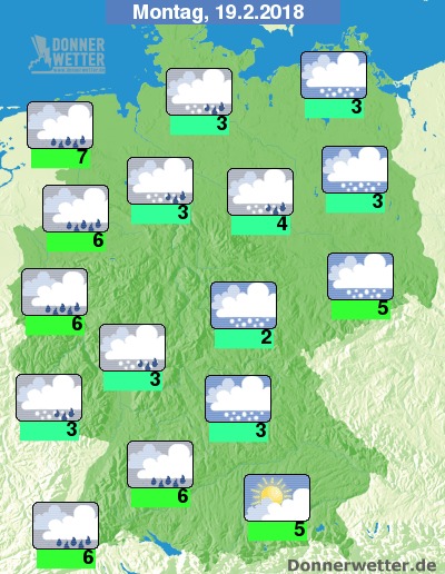 Die Temperaturen erreichen im Tagesverlauf Höchstwerte um 2 Grad C im Thüringer Bergland und um 7 Grad C in Ostfriesland.