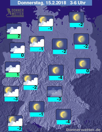 In der Nacht zum Donnerstag bleibt es vor allem über der Osthälfte Deutschlands verbreitet sternenklar. Weiter nach Westen ist es anfangs auch noch oft leicht oder aufgelockert bewölkt, in den westlichsten Landesteilen ziehen bis zum Morgen aber zunehmend dichte Wolken auf, die gegen Morgen auch ersten Schnee oder Regen bringen können, sonst bleibt es trocken. Die Temperatur sinkt auf 2 Grad an der Nordsee und bis -4 Grad im Chiemgau.
