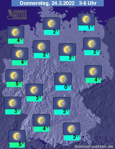 In der Nacht zum Donnerstag zeigt sich der Himmel über der Bundesrepublik sternenklar, dazu bleibt es trocken. Die Temperatur sinkt auf 5 Grad in Köln und bis 0 Grad in Jena.
