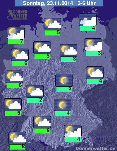 Am Abend werden die Wolken im Norden meist noch dichter, dabei kann vor allem in den Küstenbereichen gelegentlich etwas Regen fallen, sonst bleibt es meist trocken. Weiter nach Süden bleibt es dagegen bei lockerer bis aufgelockerter Bewölkung durchweg trocken. Im Südosten des Landes wird es gebietsweise sternenklar. Die Abendtemperatur liegt bei 8 Grad in Aachen und etwa 3 Grad in Berlin.