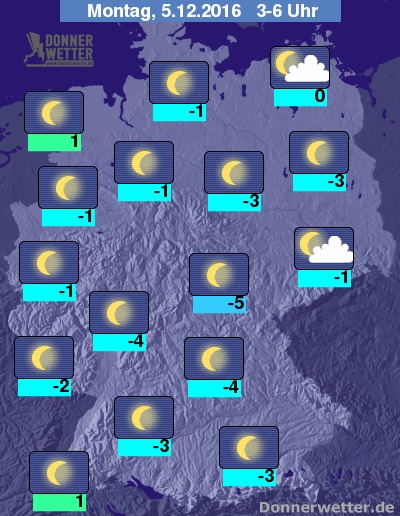 In der Nacht zum Montag ist der Himmel fast über dem gesamten Bundesgebiet sternenklar, einige, jedoch weitgehend nur lockere Wolkenfelder ziehen über den Nordosten und Osten des Landes hinweg. Es bleibt überall trocken bei Tiefstwerten zwischen 1 Grad im Oberrheingraben und -5 Grad in Oberfranken.