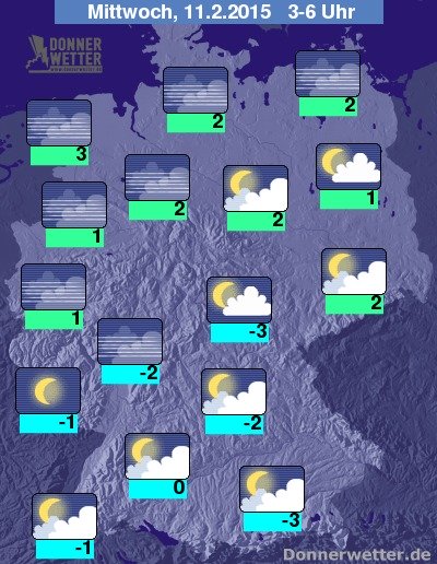 In der Nacht zum Mittwoch ist es im Norden des Landes teils sternenklar, teils jedoch auch neblig-trüb, weiter nach Süden ist es oft aufgelockert bewölkt, gebietsweise kann es aber auch hier neblig-trüb sein. Es bleibt weitgehend trocken. Die Temperatur sinkt auf 3 Grad an der Nordsee und etwa -3 Grad in München.