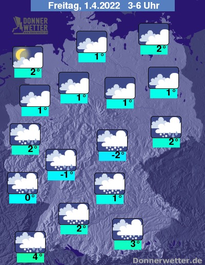 In der Nacht zum Freitag bleibt es weitgehend dicht bewölkt, an Nord- und Ostsee kann es stellenweise auch auflockern. Über der Südhälfte des Landes fällt immer wieder Schnee, Schneeregen oder Regen, weiter nach Norden hin bleibt es hingegen weitgehend trocken. Die Temperatur sinkt auf 4 Grad in Freiburg und bis -2 Grad in Jena.