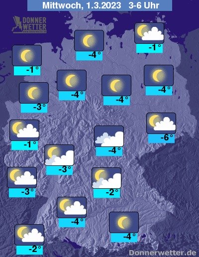 In der bevorstehenden Nacht halten sich über der Südhälfte gebietsweise dichte Wolken, teils ist es hier aber auch nur locker bewölkt bis sternenklar. Über der Nordhälfte der Republik ist es weitgehend sternenklar. Es bleibt trocken bei Tiefstwerten von -1 Grad im nördlichen Emsland und -6 Grad in der Lausitz.