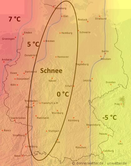 Die folgende Karte zeigt die Schnee- und Temperaturverteilung für Deutschland am Dienstag: