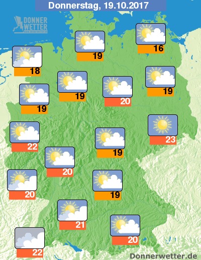 Nach Auflösung von örtlich zähen Nebelfeldern wird es in Deutschland vielfach wieder freundlich und trocken. Vor allem im Westen und im Norden schirmen durchziehende hohe und mittelhohe Wolkenschleier die Sonne gebietsweise milchig ab. Nach oft lauer Nacht, erwärmt sich die Luft bis zum Nachmittag erneut auf 17 bis 23 Grad. Etwas kühler bleibt es bei zäherem Nebel, sowie an den Küsten und auf den Gipfeln der Mittelgebirge. Der Wind weht meist nur schwach bis mäßig und kommt vorwiegend aus Südost bis Südwest.