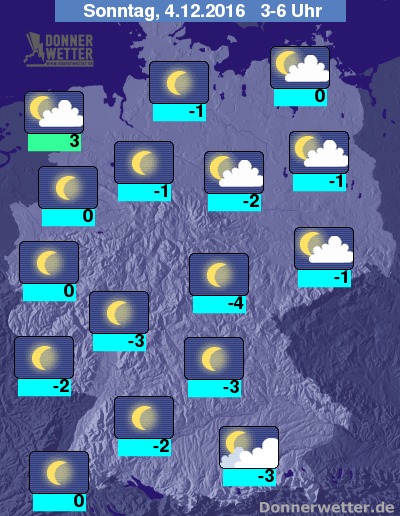 In der Nacht zum Sonntag funkeln über dem Bundesgebiet verbreitet die Sterne. Lockere Wolken ziehen über den Nordosten, Osten, den Alpenrand und im Nordseeumfeld durch. In den übrigen Gebieten ist es weitgehend sternenklar, dazu bleibt es im ganzen Land trocken. Die Temperatur sinkt auf 3 Grad an der Nordsee und bis -4 Grad in Unterfranken.