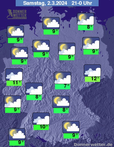 In der Nacht auf Samstag ist der Himmel über dem Westen und Südwesten stark bewölkt oder bedeckt, dabei kann gebietsweise auch etwas Regen fallen. In den übrigen Landesteilen dominiert lockere oder aufgelockerte Bewölkung, vor allem im Südosten Bayerns kann es auch aufklaren. In den Niederungen kann sich in der Nacht Nebel bilden.