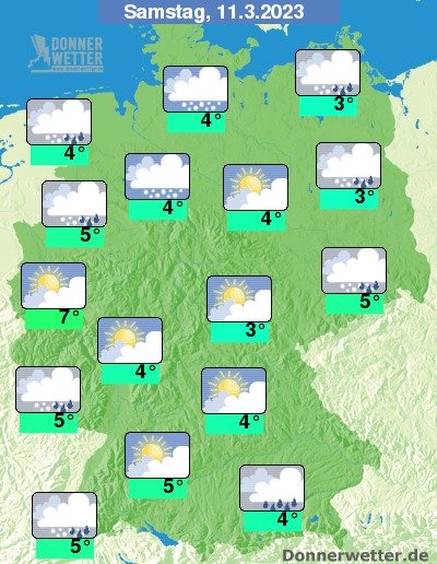 Am Samstag zeigen sich zum Teil heitere Abschnitte, teilweise ziehen jedoch dichte Wolken durch, dabei bleibt es über der Südhälfte zumeist trocken, während sich sonst örtliche Schnee- oder Schneeregenschauer bilden. Die Temperatur steigt auf 3 Grad in Erfurt und bis 7 Grad in Köln.