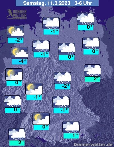 In der Nacht zum Samstag lockert es in den westlichen Landesteilen oft wieder auf, sonst halten sich noch dichte Wolken und vor allem bis Mitternacht fällt häufig Schnee, anfangs auch noch Schneeregen. Zum Morgen hin fällt lediglich an den Alpen noch gebietsweise Schnee. Die Temperatur sinkt auf 2 Grad in Dresden und bis -4 Grad in Meppen.