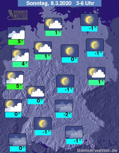 Am Sonntag ist es im Osten und Südosten oft locker bis aufgelockert, im übrigen Bundesgebiet jedoch meist stark bewölkt, dabei ist es zunächst trocken. Im weiteren Verlauf ziehen jedoch von Westen dichte Wolken mit Regen auf, der sich bis zum Abend etwa bis auf die Westhälfte des Landes ausbreitet. Die Temperatur erreicht 7 Grad am Westerwald und bis 11 Grad in der Lausitz.